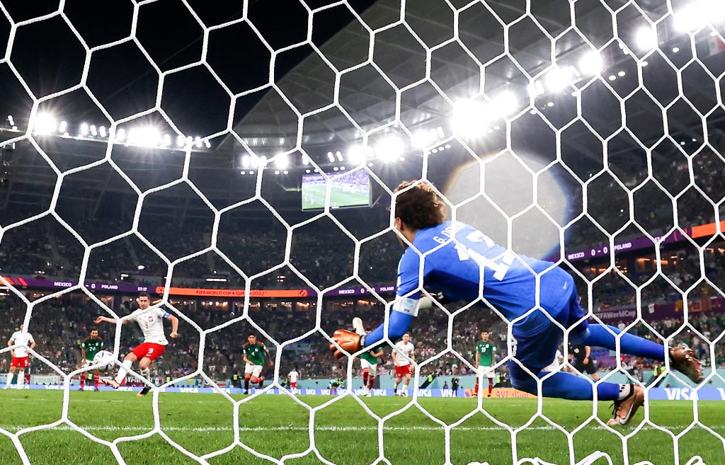 11月22日,突尼斯队守门员艾门·达门(上)在比赛中扑救。当场突尼斯队和丹麦队0:0战平。