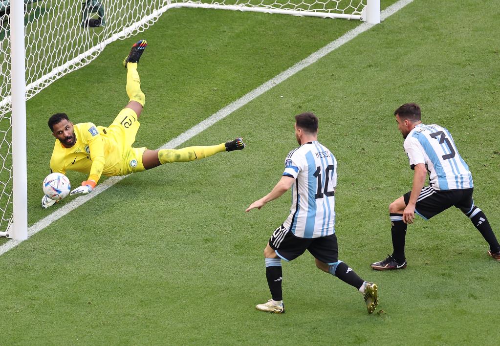 11月22日,沙特阿拉伯队门将奥韦斯(左)在对阵阿根廷队的比赛中扑救成功。