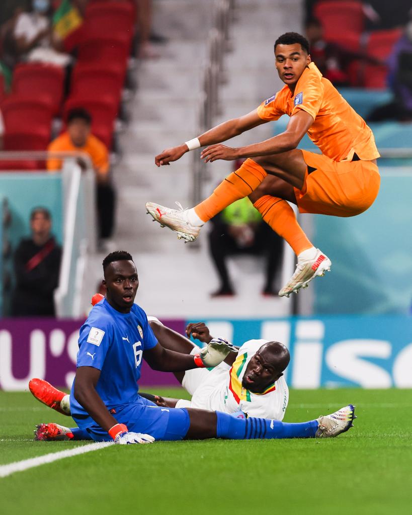 11月22日,塞内加尔队门将门迪(下方蓝衣)在比赛中拼抢。