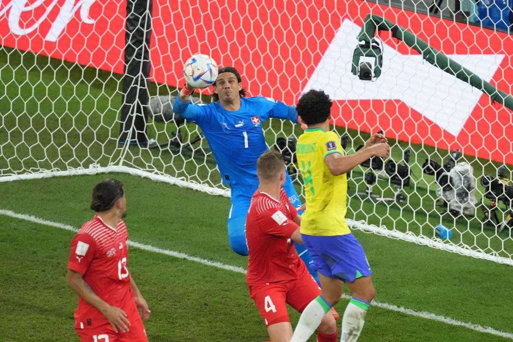 11月29日,索默(上)在对阵巴西队的小组赛中救球。