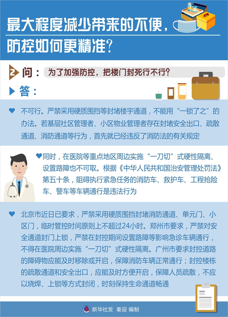 北京市近日已要求,严禁采用硬质围挡封堵消防通道、单元门、小区门,临时管控时间原则上不超过24小时。郑州市要求,严禁对安全通道封门上锁,严禁在封控期间设置路障等影响急诊车辆通行,不得在医院周边实施“一刀切”式硬性隔离。广州市要求封控道路的障碍物应能及时移除或开启,保障消防车辆正常通行;封控楼栋的疏散通道和安全出口,应能及时方便开启,保障人员疏散,不应以烧焊、上锁等方式封闭,时刻保持生命通道畅通。