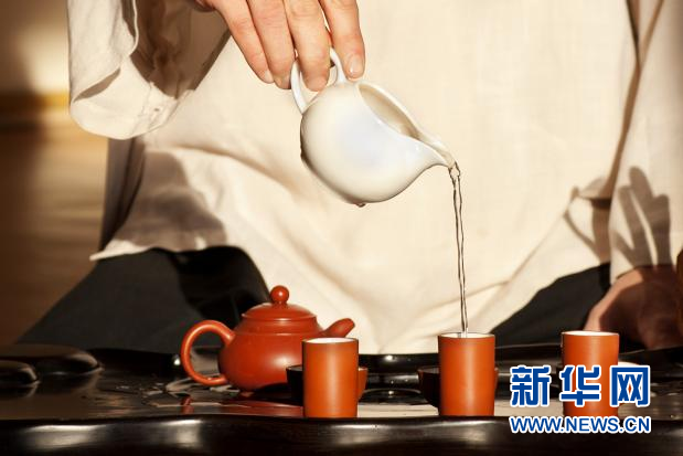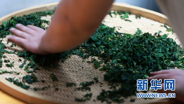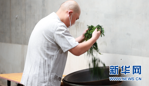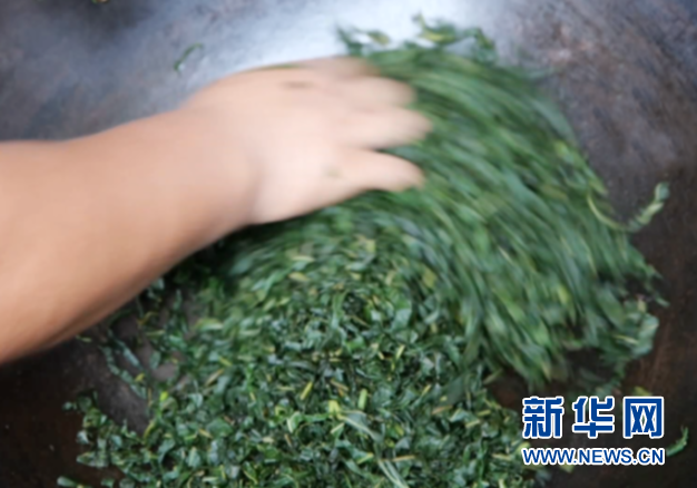 将桑叶放置锅中,用双手来回翻转,大小火交替炒制,待淡淡茶香缓缓溢出,桑叶就完成“变身”桑叶茶的过程。新华网发 张曾良摄