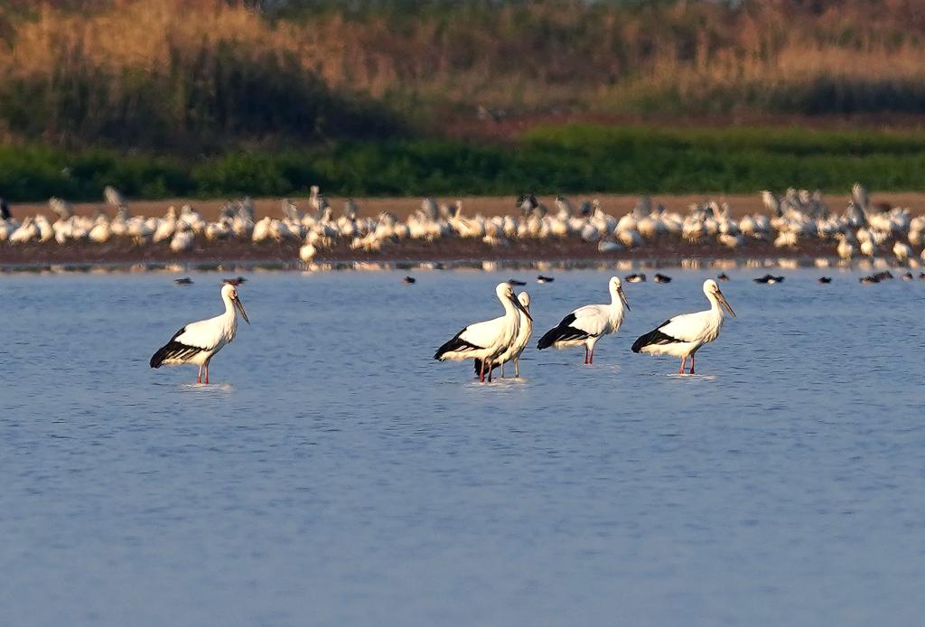 11月11日,东方白鹳等候鸟在江西鄱阳湖南矶湿地国家级自然保护区的湿地栖息。新华社记者万象 摄