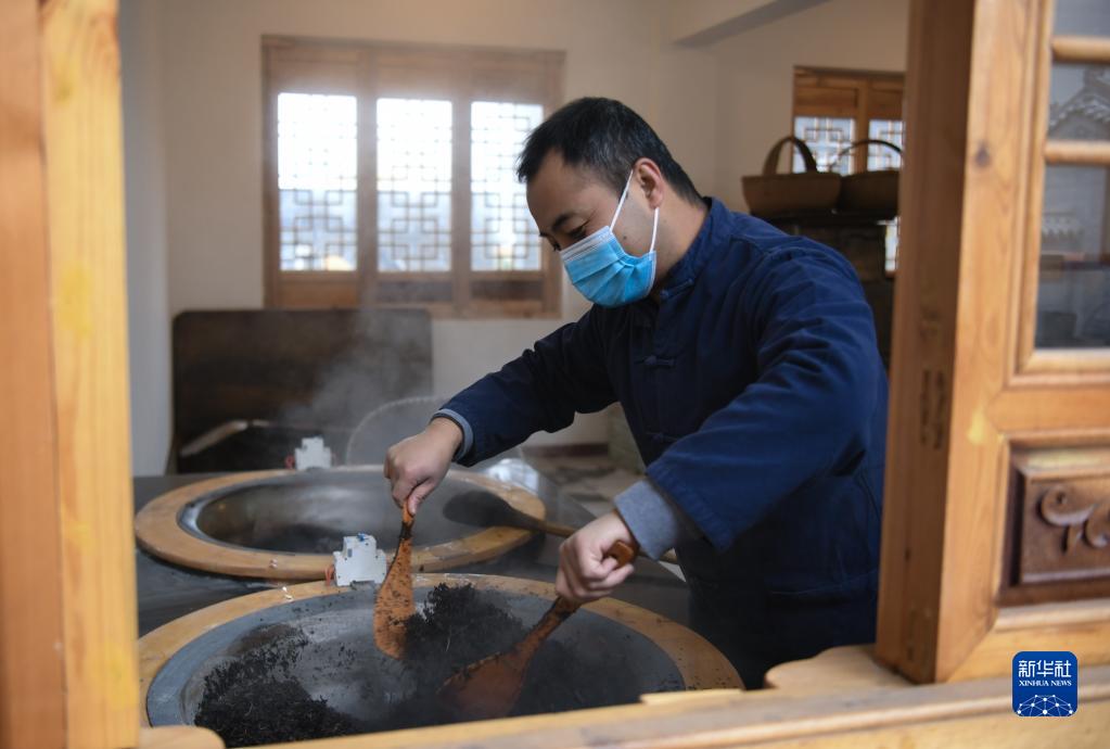 在咸阳“益生源记”仿古茯茶作坊,筑茶师王萌乐展示炒茶工艺(11月30日摄)。