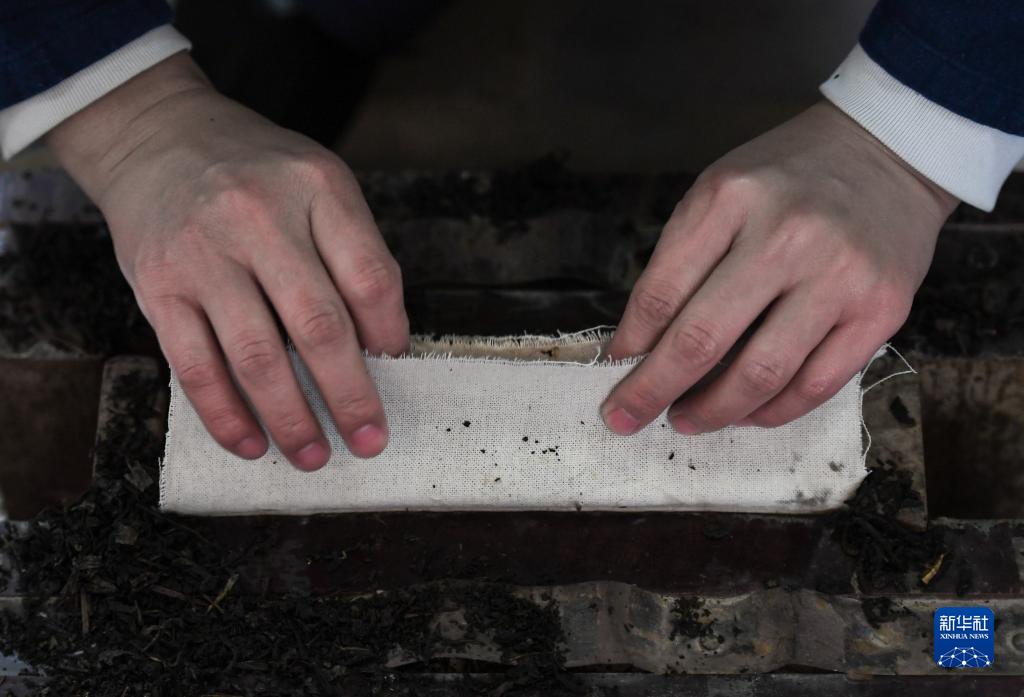 在咸阳“益生源记”仿古茯茶作坊,筑茶师刘林展示灌封工艺(11月30日摄)。
