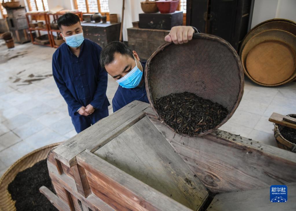 在咸阳“益生源记”仿古茯茶作坊,筑茶师王萌乐(右)展示清选工艺(11月30日摄)。
