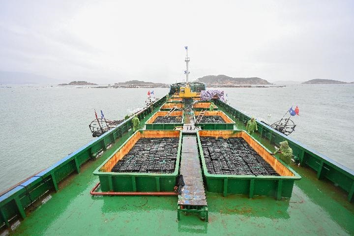 这是11月25日在福州连江县苔菉镇后湾海域拍摄的运输船上装载的鲍鱼。新华社记者 周义 摄