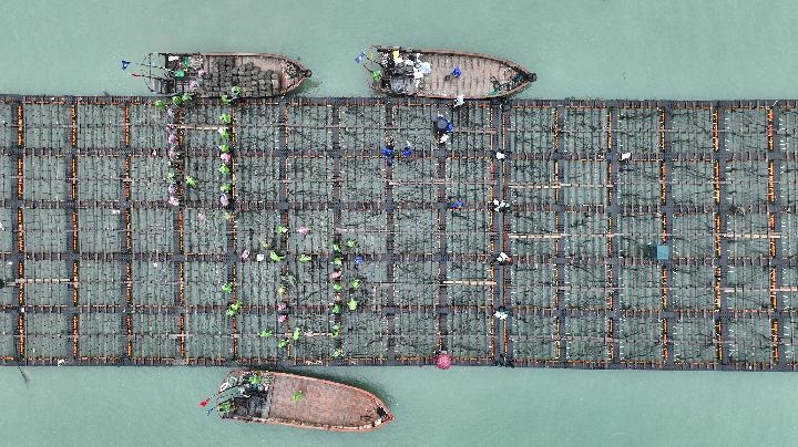 11月25日,在福州连江县苔菉镇后湾海域,渔民把从运输船上卸下的鲍鱼养殖箱运到渔排上进行挂笼立体放养(无人机照片)。新华社记者 周义 摄