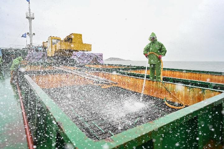 11月25日,在福州连江县苔菉镇后湾海域,渔民在运输船上冲洗鲍鱼养殖箱。新华社记者 周义 摄