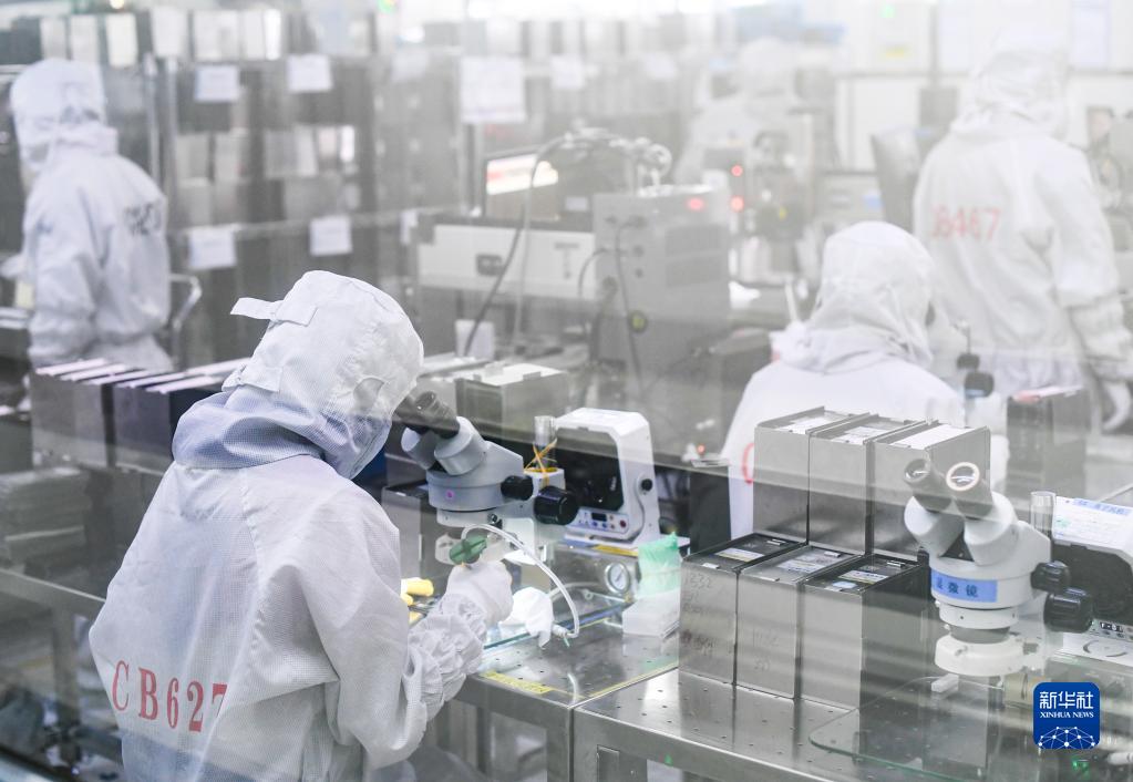 12月3日,在位于渝北区的重庆临空智能终端产业园,重庆市天实精工科技有限公司工作人员在摄像头智能化封装车间作业。