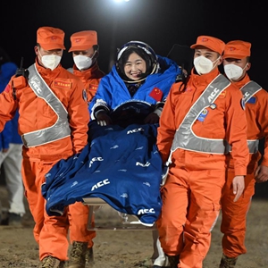 12月4日,神舟十四号载人飞船返回舱在东风着陆场成功着陆。这是航天员刘洋安全顺利出舱。新华社记者 连振 摄