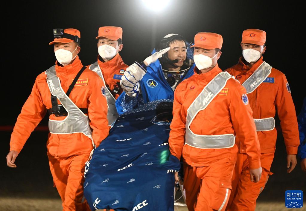12月4日,神舟十四号载人飞船返回舱在东风着陆场成功着陆。这是航天员陈冬安全顺利出舱。新华社记者 连振 摄
