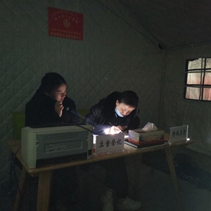 2021年5月26日,在抗震救灾临时办公点的帐篷内,玛多县人民法院法官助理更周措(右)在手电筒照射的灯光下进行立案登记。受访者供图