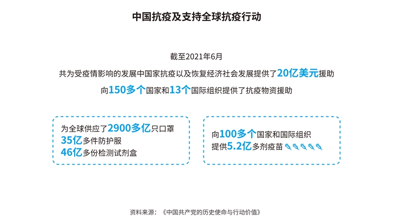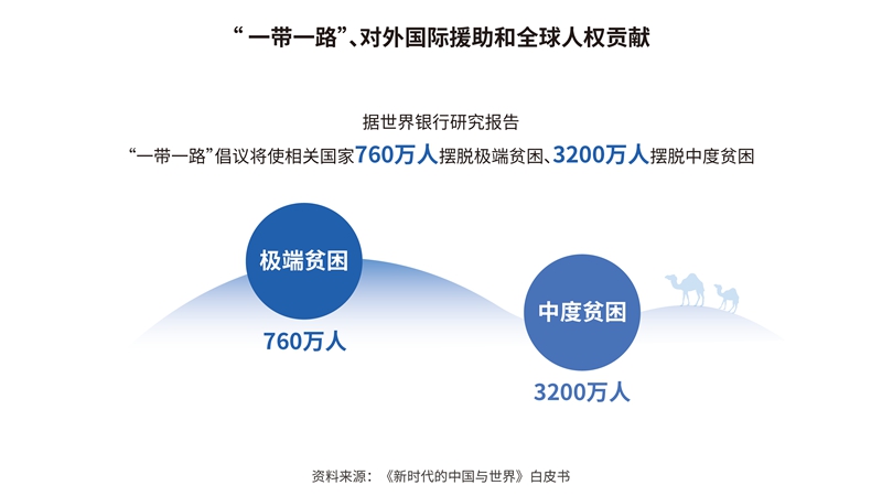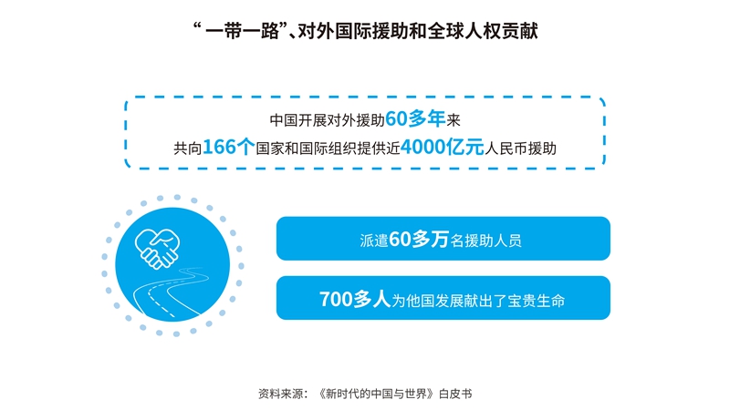 中国先后批准或加入了30余项国际人权文书,其中包括6项联合国核心人权条约;累计共向166个国家和国际组织提供了援助,派遣60多万名援助人员;多次无条件免除重债穷国和最不发达国家对华到期政府无息贷款债务。在联合国维和行动中,中国是安理会常任理事国第一大出兵国,30多年来累计派出维和官兵5万余人次。共建“一带一路”已成为助力各国发展、深受世界欢迎的新兴国际公共产品,据世界银行研究报告,到2030年,将使相关国家760万人摆脱极端贫困、3200万人摆脱中度贫困。新冠肺炎疫情暴发以来,中国努力促进新冠疫苗在全球范围内公平合理分配,成为全球对外提供疫苗数量最多的国家。