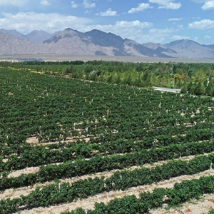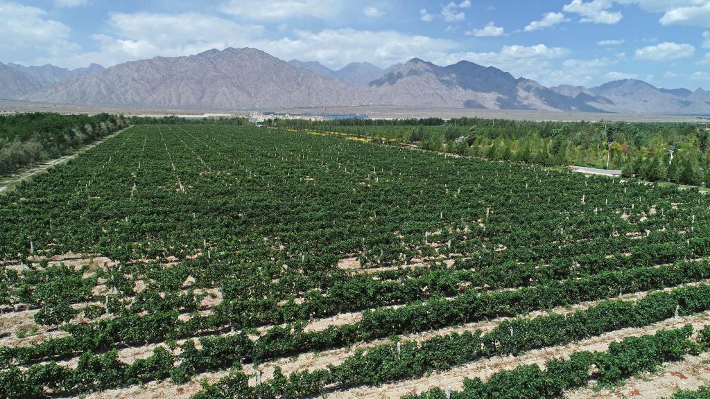 这是2022年9月4日拍摄的贺兰山东麓的酿酒葡萄种植基地(无人机照片)。新华社记者王鹏摄