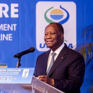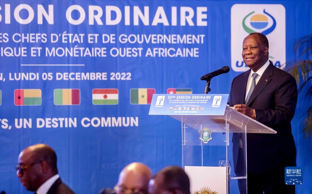 12月5日,在科特迪瓦经济首都阿比让,科特迪瓦总统瓦塔拉在西非经济货币联盟第23届国家元首和政府首脑会议上讲话。新华社发(伊万·宋摄)