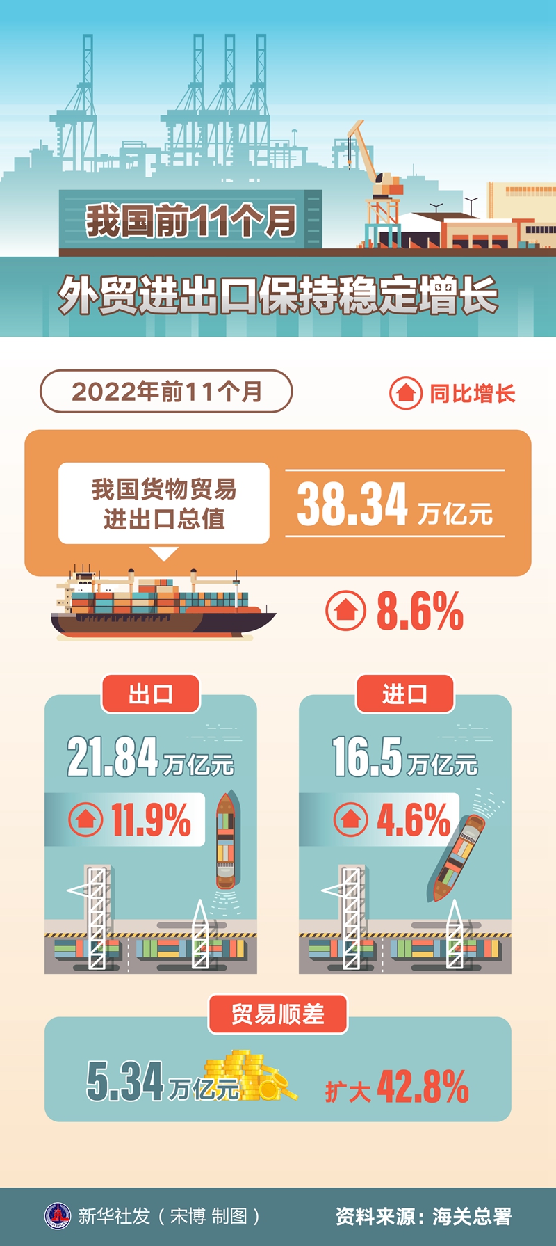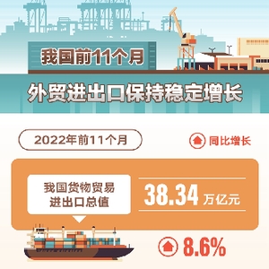 新华社北京12月7日电(记者邹多为)海关总署7日发布数据:今年前11个月,我国货物贸易进出口总值38.34万亿元,同比增长8.6%。其中,出口21.84万亿元,增长11.9%;进口16.5万亿元,增长4.6%;贸易顺差5.34万亿元,扩大42.8%。