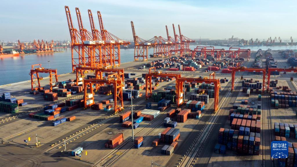 12月7日拍摄的唐山港京唐港区集装箱码头一角(无人机照片)。新华社发(李磊 摄)