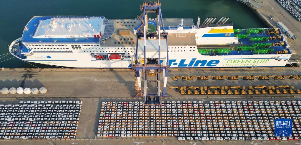 12月7日,出口商品车在山东港口烟台港集结装船(无人机照片)。新华社发(唐克 摄)