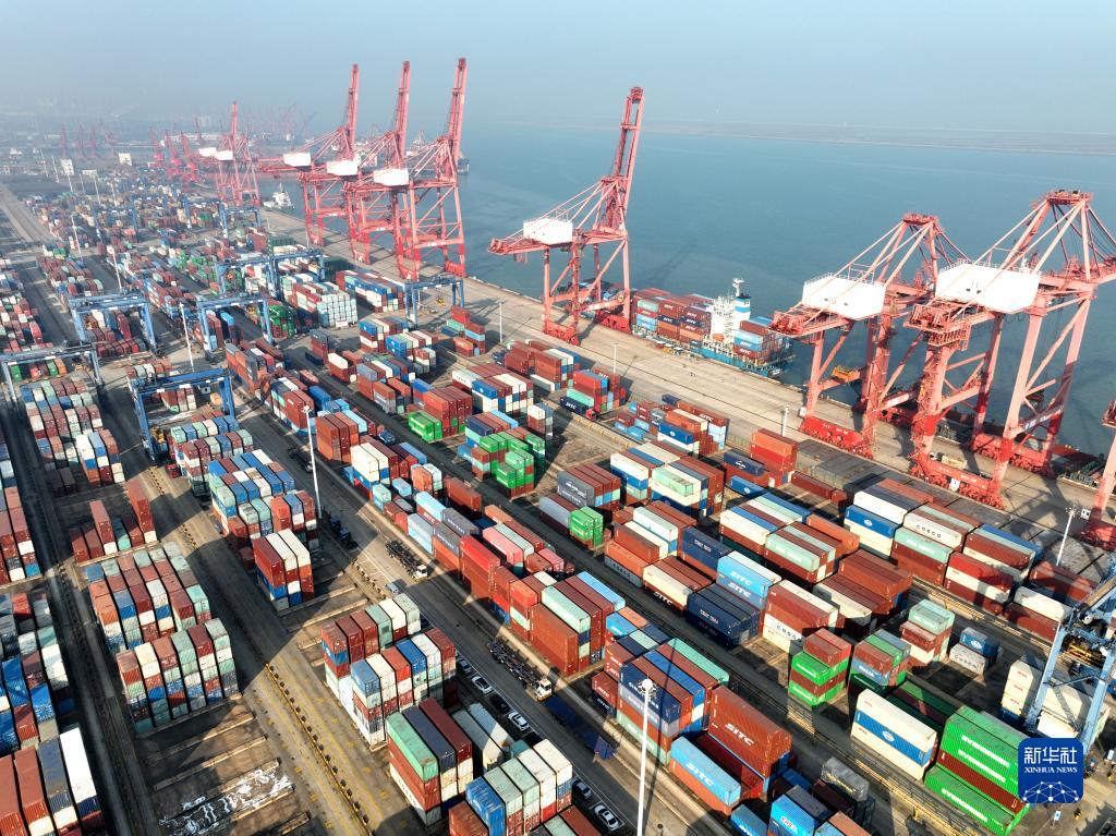 12月7日,货轮在江苏连云港港进行装卸作业。新华社发(耿玉和 摄)