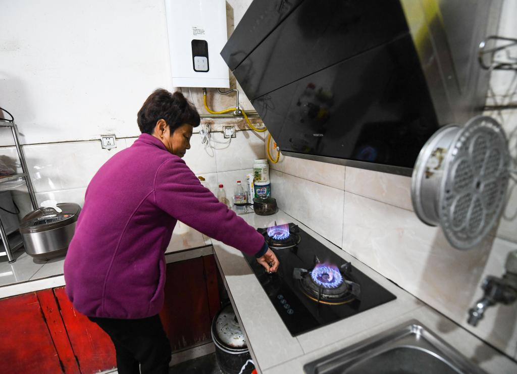 在成都市温江区永宁街道八角社区,钟昭琼点燃自家的天然气燃气炉。新华社记者王曦 摄