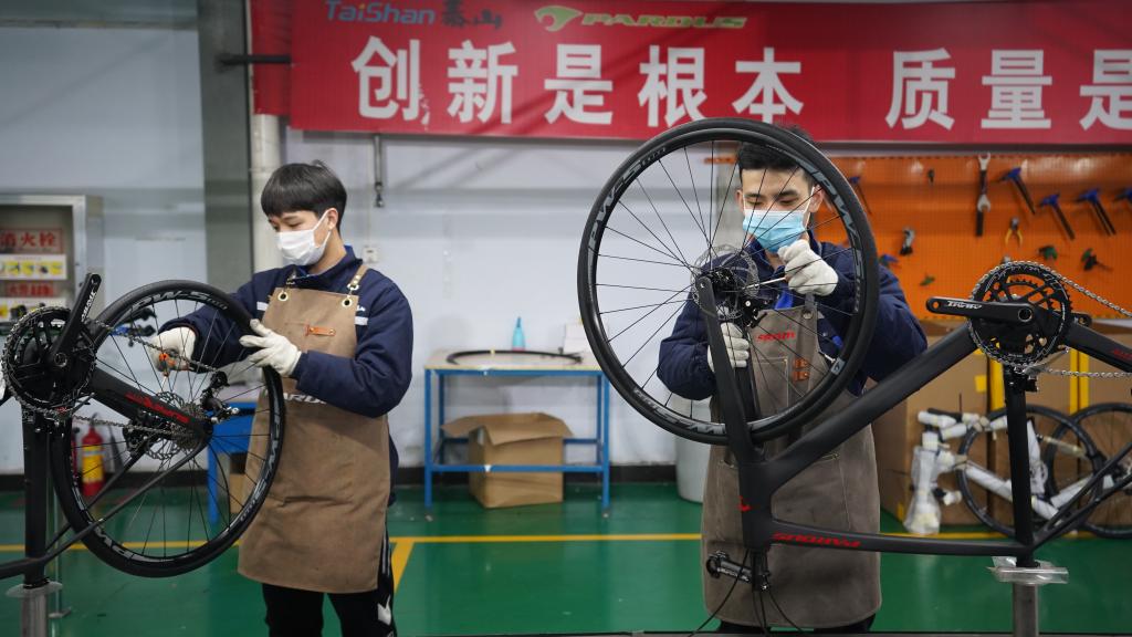 山东泰山瑞豹复合材料有限公司员工在车间组装碳纤维自行车。(受访者供图)