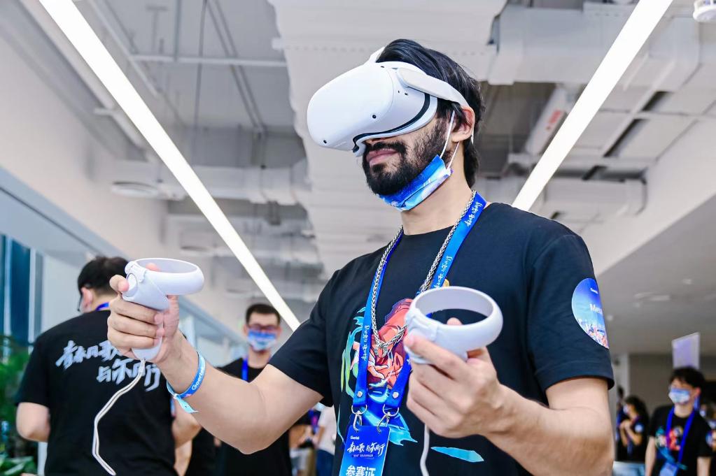 在2022年“歌尔杯”高校VR/AR大赛上,参赛者体验VR产品。(受访者供图)