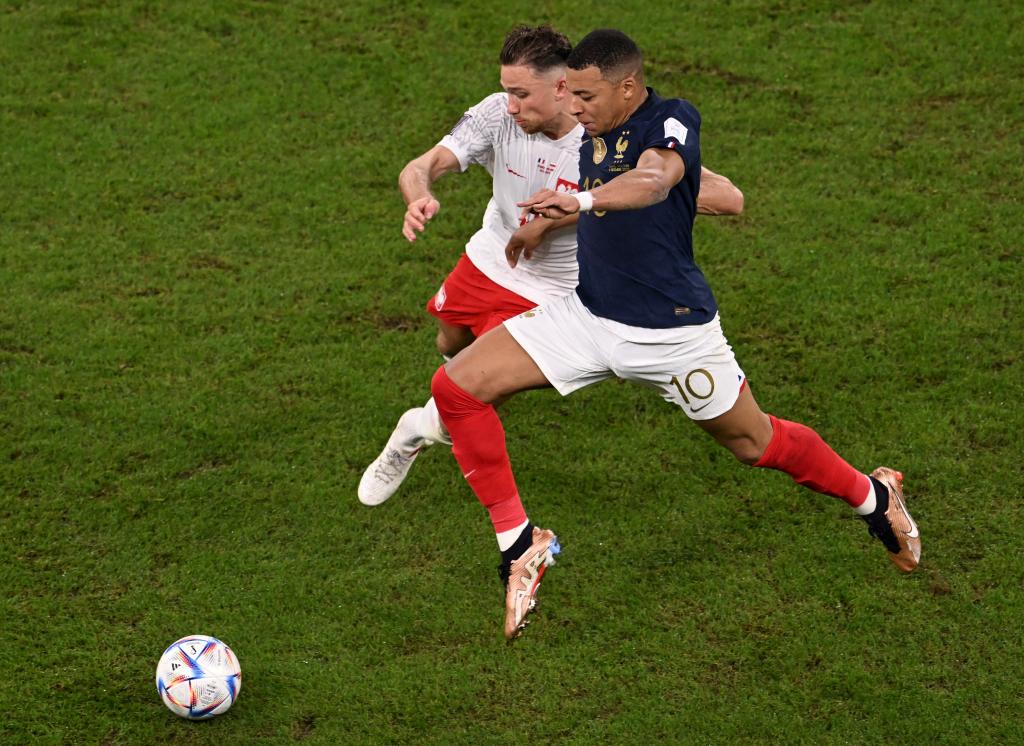 ↓12月4日,法国队球员姆巴佩(右)与波兰队球员卡什在比赛中拼抢