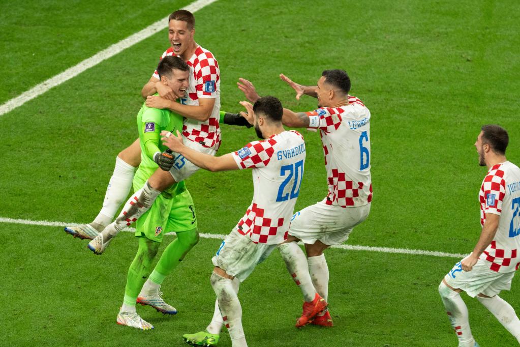 ↓12月5日,克罗地亚队球员在点球大战战胜日本队后庆祝