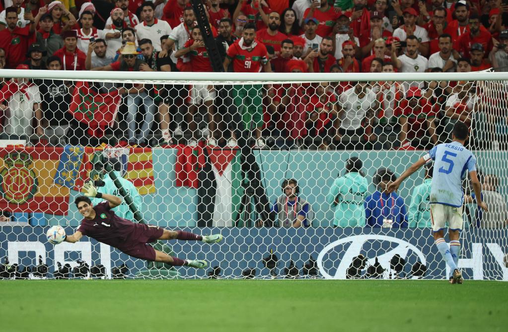 ↑12月6日,摩洛哥队守门员布努(左)扑出西班牙队球员布斯克茨的点球