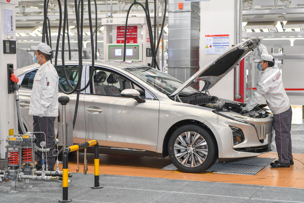 在位于吉林长春的中国第一汽车集团有限公司红旗繁荣工厂,工人装配车辆。新华社记者张楠 摄