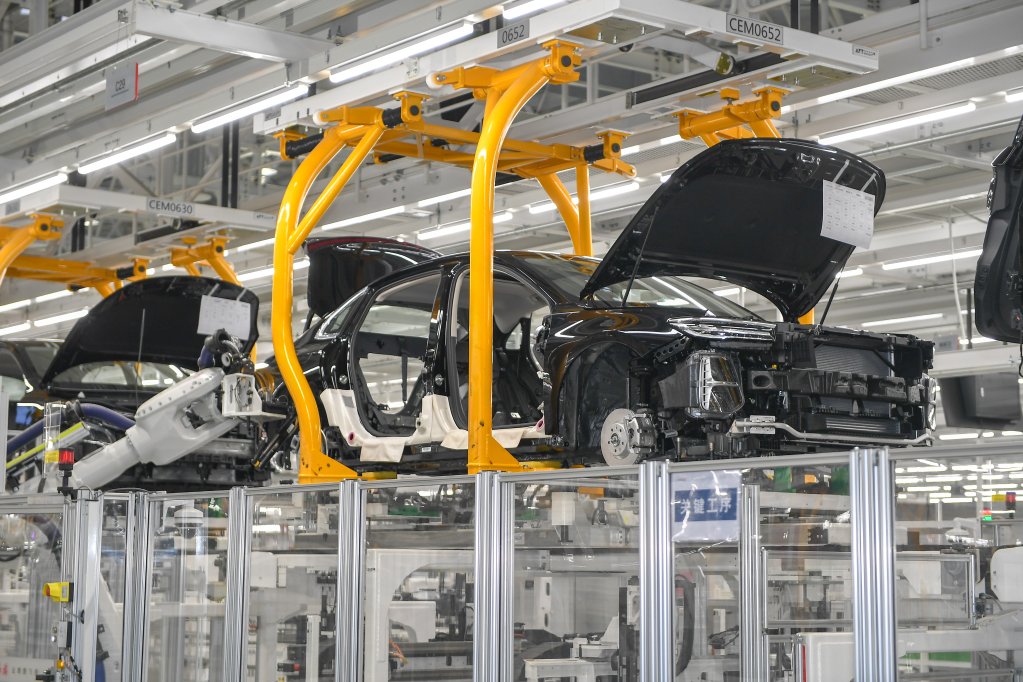 在位于吉林长春的中国第一汽车集团有限公司红旗繁荣工厂,车辆等待装配。新华社记者张楠 摄