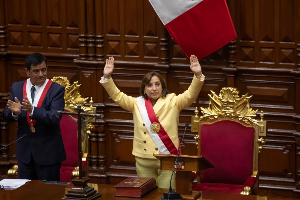 12月7日,在秘鲁利马,迪娜·博卢阿特(右)在国会宣誓就任总统。新华社发(玛利亚娜·巴索摄)