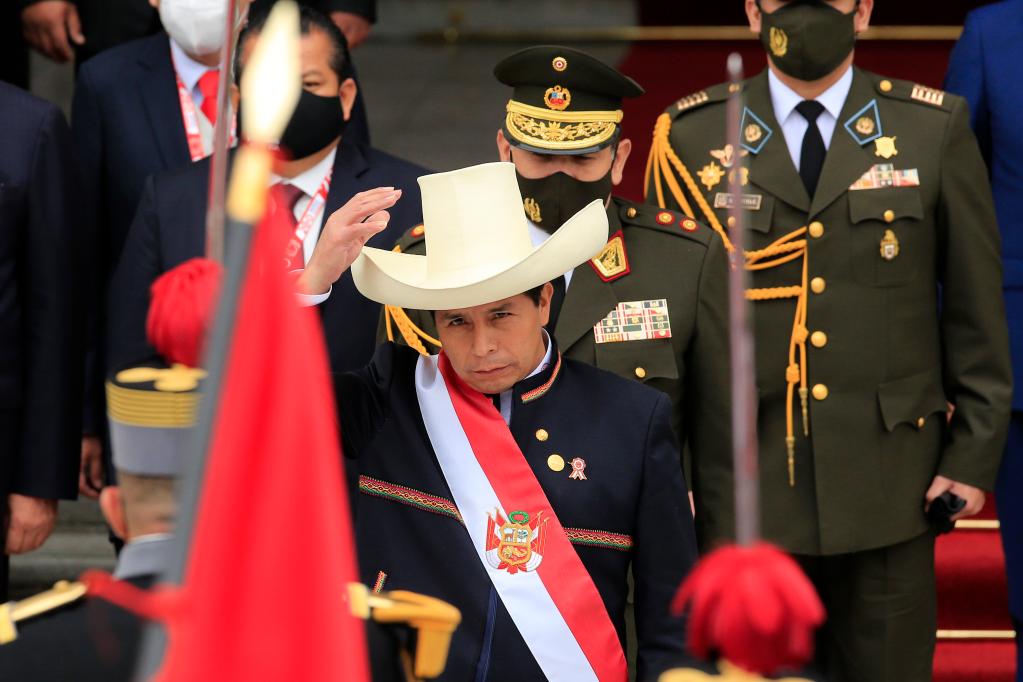 2021年7月28日,在秘鲁首都利马,卡斯蒂略在宣誓就职后检阅仪仗队。新华社发(玛利亚娜·巴索摄)