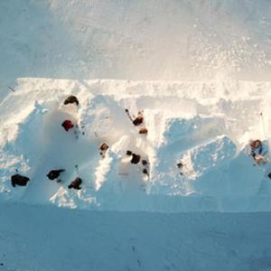 12月8日,雪雕师在哈尔滨太阳岛雪博会园区创作雪雕作品(无人机照片)。