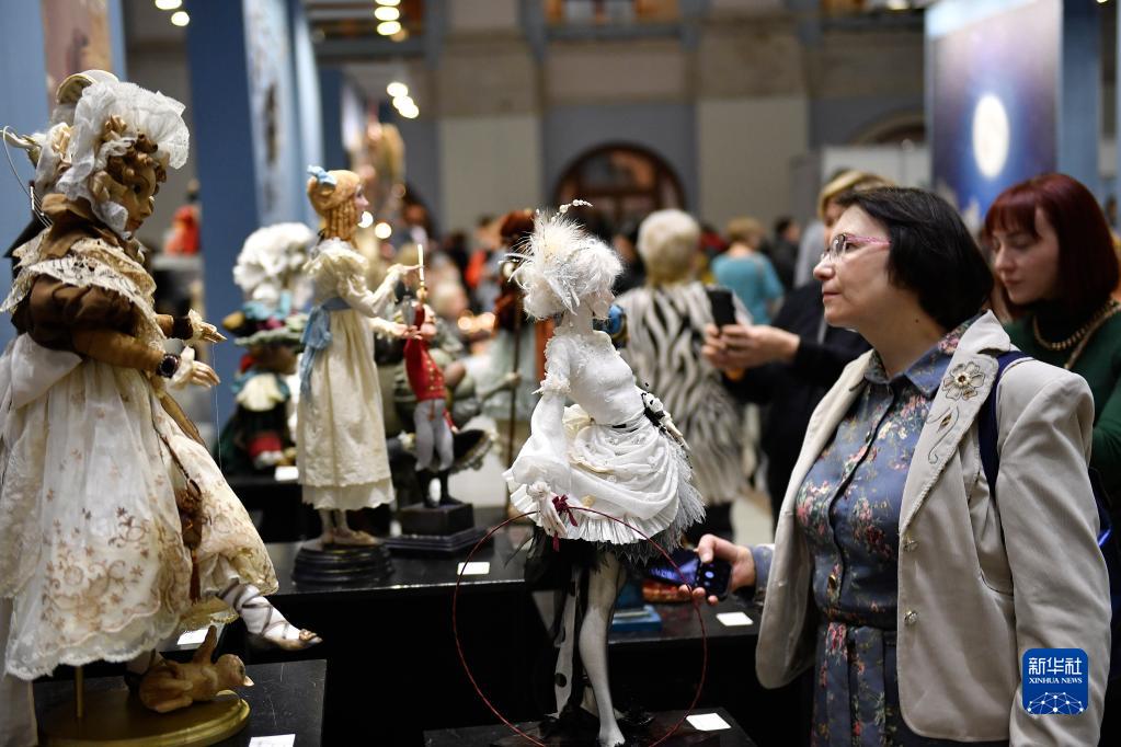 12月10日,参观者在俄罗斯莫斯科玩偶艺术展上观看展品。
