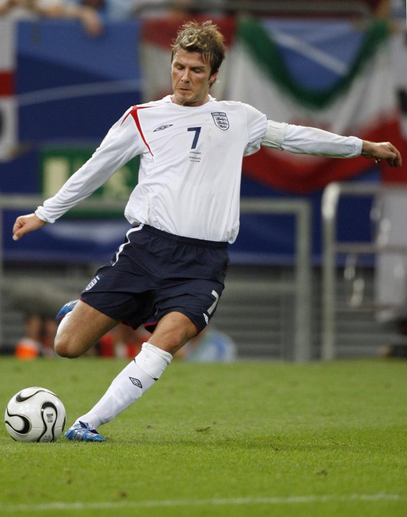 2006年7月1日,英格兰队对阵葡萄牙队。英格兰队球员贝克汉姆罚任意球。