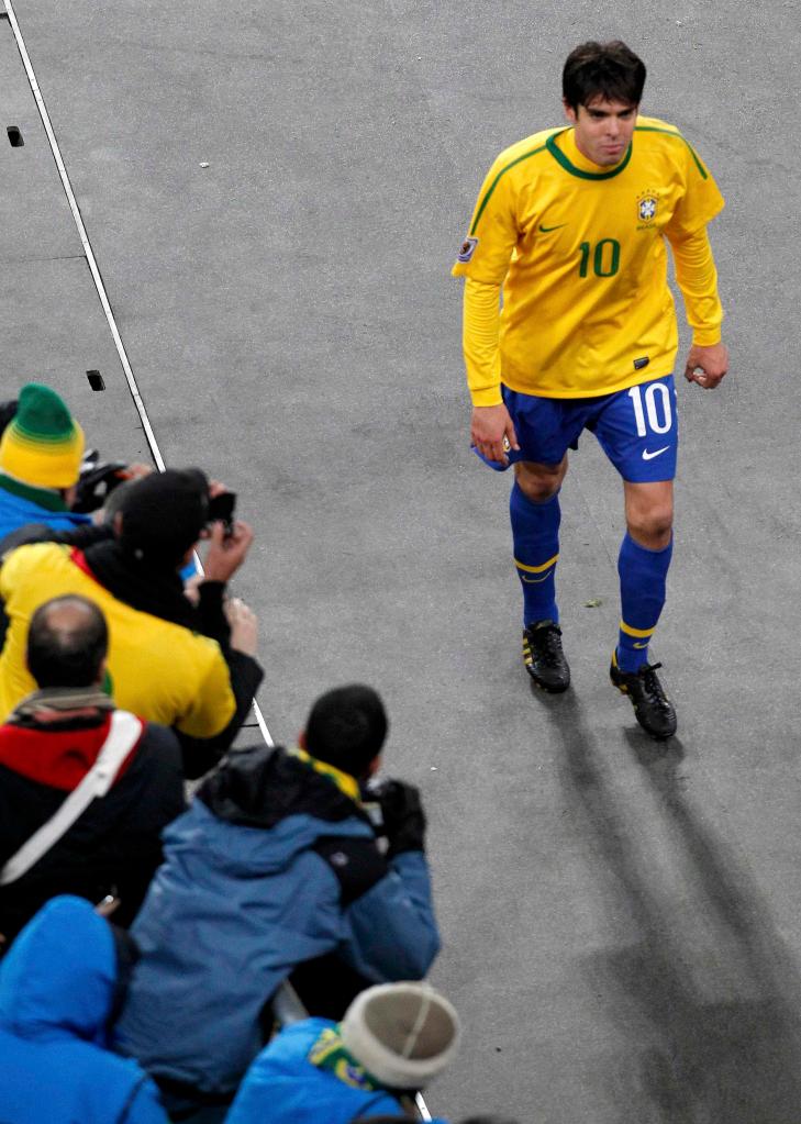2010年6月20日,巴西队球员卡卡(右一)累计两张黄牌,被主裁判出示红牌罚出场外。
