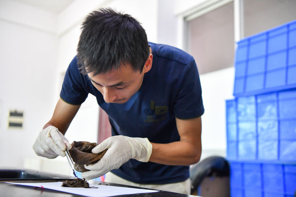 ↑ 2018年8月25日,观测研究站的科研人员李旭在实验室观察从洞庭湖中取回的苔草样本。