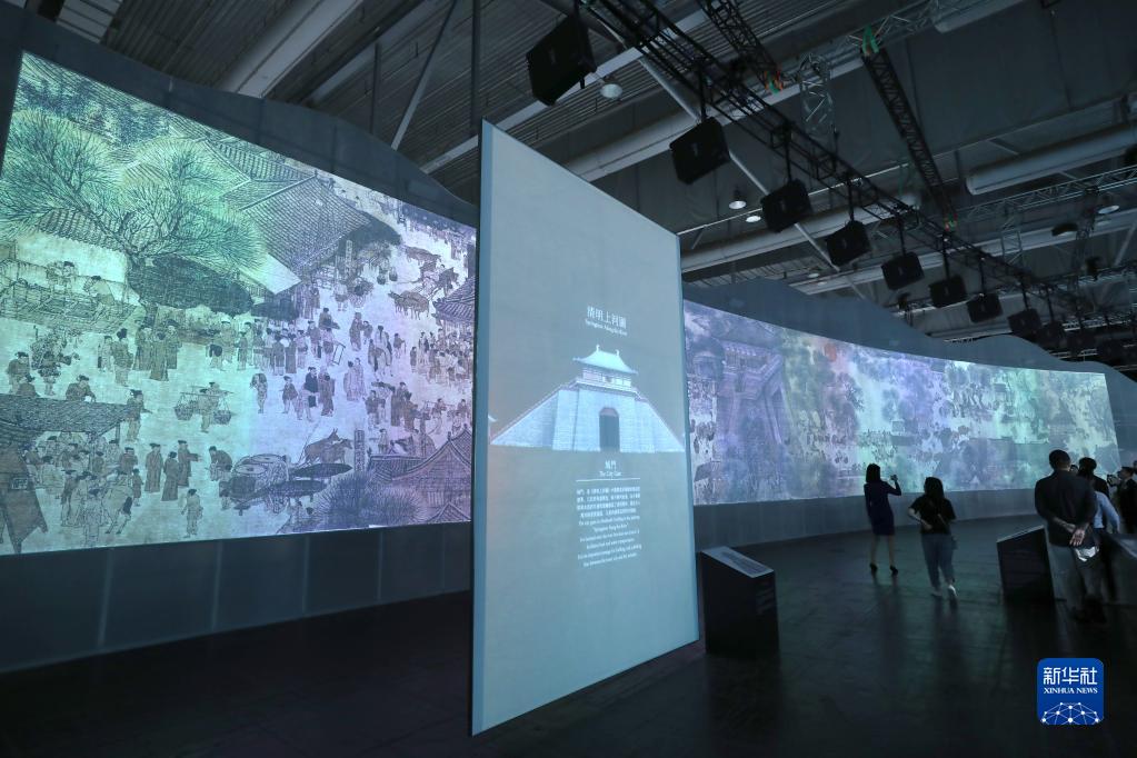 参观者在中国国家博物馆的“盛世修典——‘中国历代绘画大系’成果展”上观看放大两倍的《千里江山图》灯光特效图(2022年9月29日摄)。新华社记者 金良快 摄