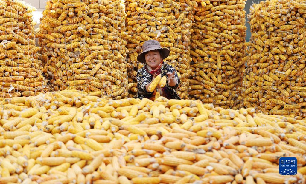 山东省临沂市郯城县郯城街道宋屯村村民在整理晾晒收获的玉米(9月23日摄)。新华社发(张春雷 摄)