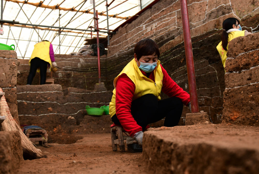 ↑12月10日,工作人员在河南南阳黄山遗址考古发掘现场作业。新华社发(陈辉 摄)