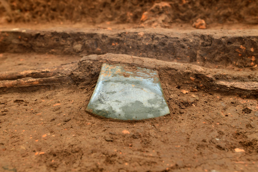 ↑这是12月10日在河南南阳黄山遗址拍摄的屈家岭文化高级别大型墓葬中随葬的玉钺。新华社发(陈辉 摄)