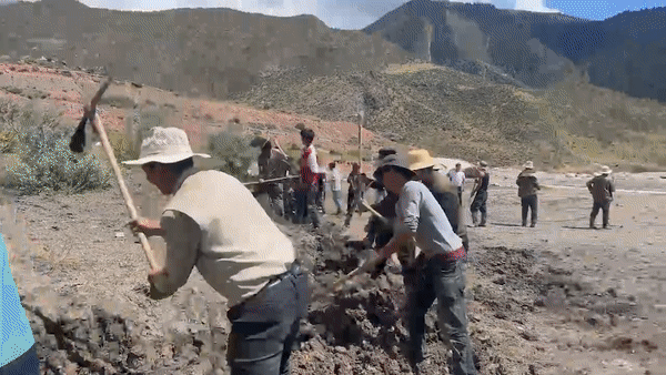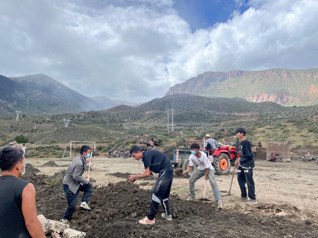 马利镇马利村的孩子正在跟大人们一起平整场地。