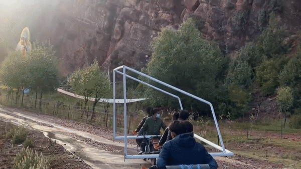 马利镇马利村的村民骑着摩托车把球门运回村里。