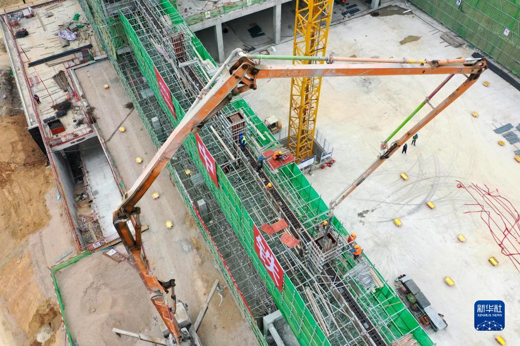 12月12日,工作人员在进行混凝土浇筑(无人机照片)。