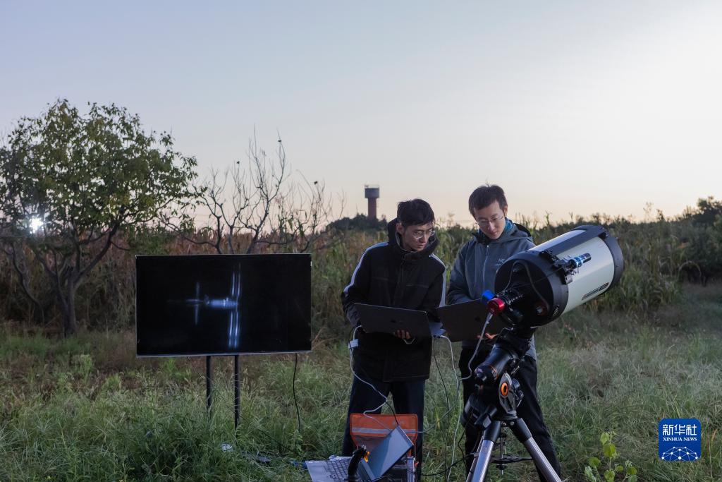 9月21日凌晨,刘博洋(左)展示当日拍摄的中国空间站过境画面。