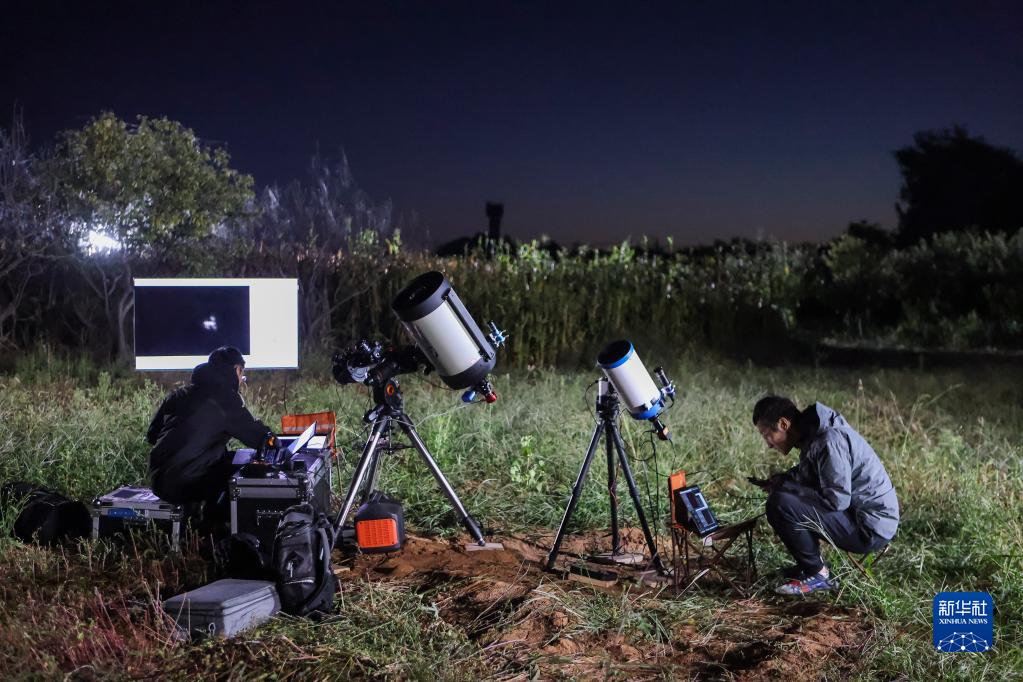 9月21日凌晨,刘博洋(左)在北京密云拍摄中国空间站过境,屏幕中为望远镜捕捉到的中国空间站过境实时画面。