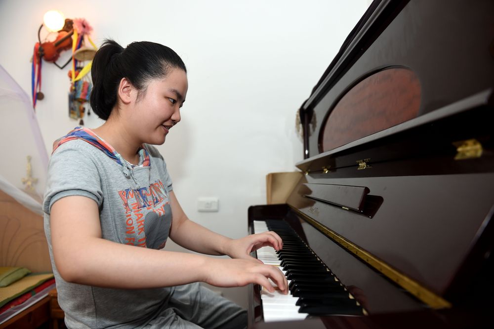 ↑王香君在家中演奏钢琴(2015年7月13日摄)。