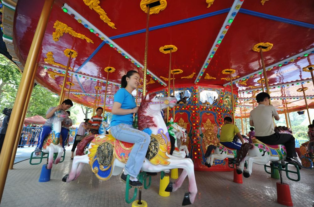 ↑王香君(前)和她的小伙伴在合肥市逍遥津公园第一次乘坐旋转木马(2010年5月31日摄)。